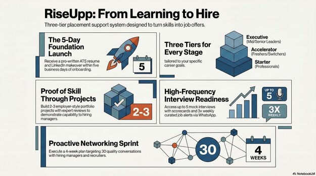 RiseUpp Placement Support keeps it clear and practical. With steady effort and our structured system, you move from learning to interviews, offers, and growth—one focused week at a time.
